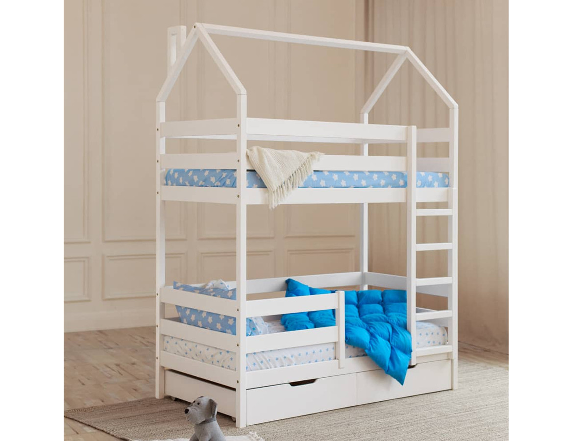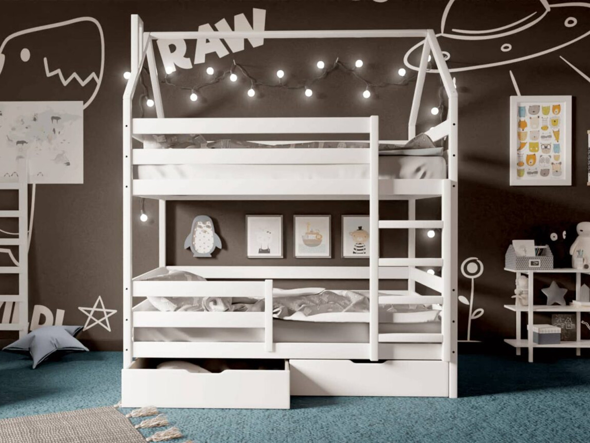 - Двухъярусная кровать-домик белый 80х190 см с ящиками