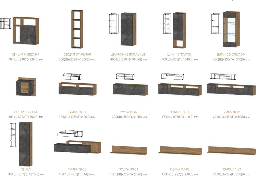 Цена за комплект: Секция навесная, Секция открытая, Тумба ТВ-05, Полка ПЛ-03