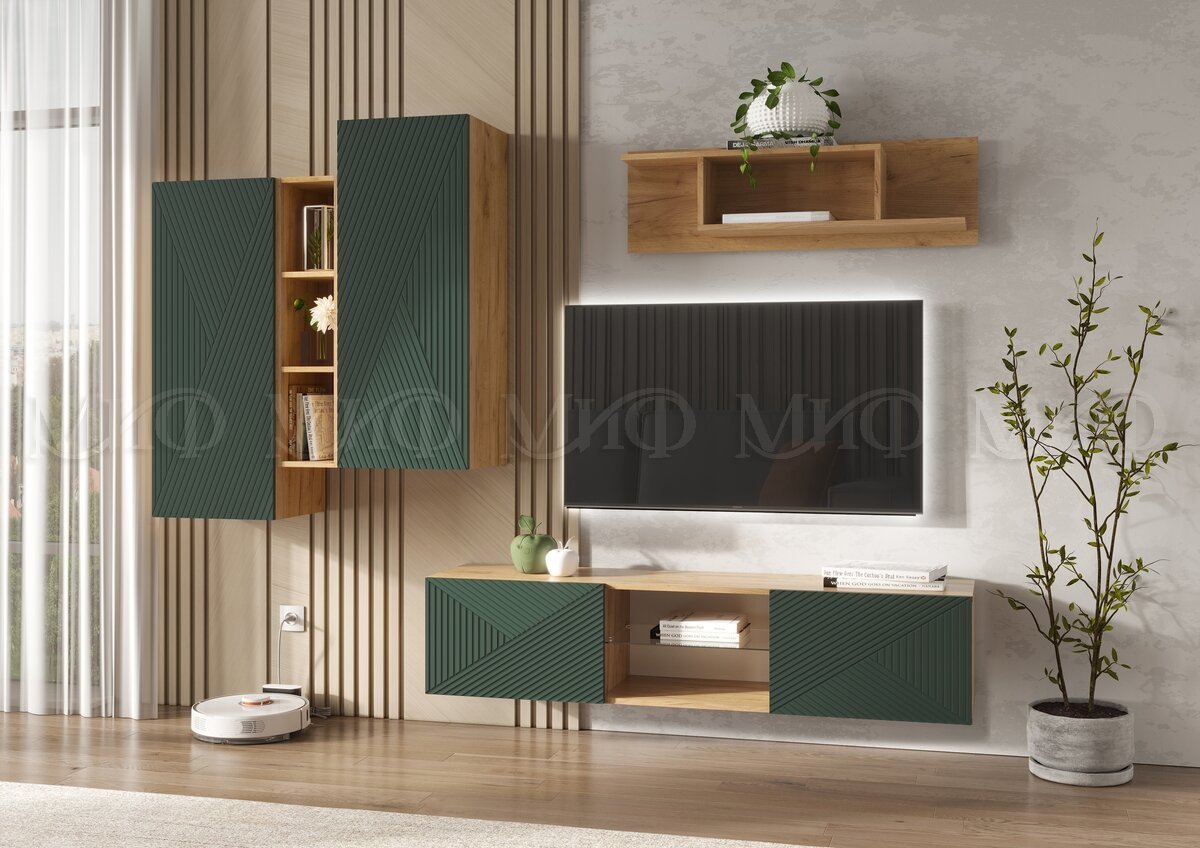 - Гостиная навесная Флэш Браш Мени Грин, Дуб Крафт