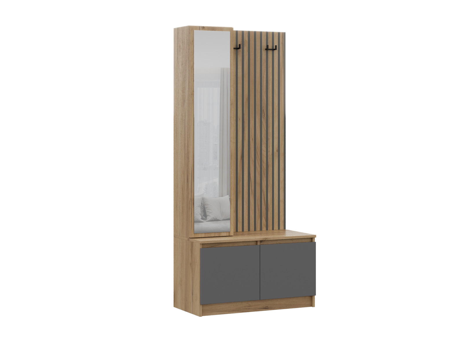 - Щит для одежды с крючками и фотопечатью (имитация реек).