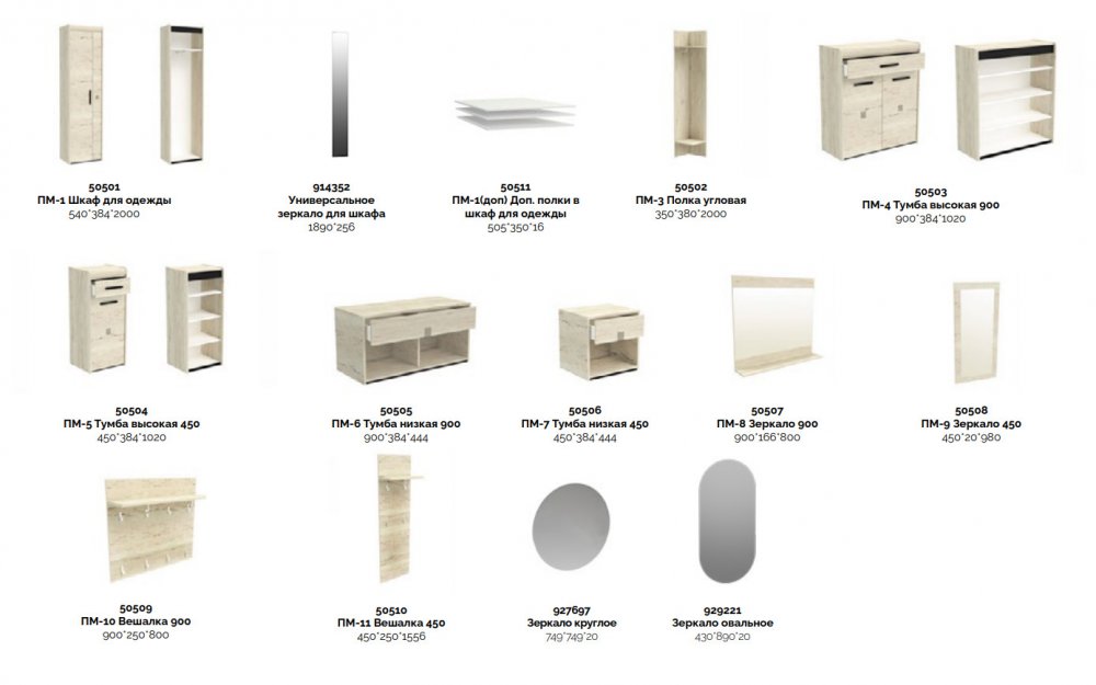 Цена за комплект: ПМ-1 Шкаф для одежды, ПМ-3 Полка угловая, ПМ-4 Тумба высокая, ПМ-8 Зеркало
