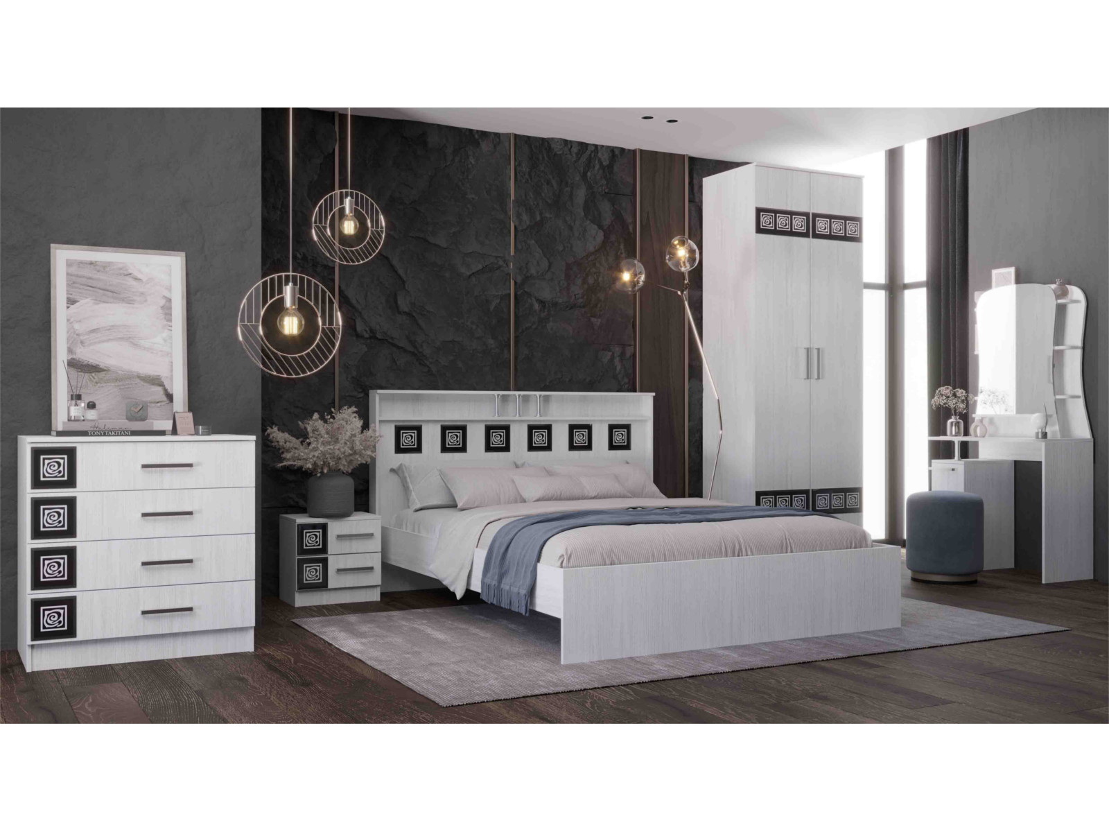 Цена за комплект: Кровать 2-х спальная 1400, Тумба прикроватная, Комод, Шкаф 2-х створчатый, Туалетный столик