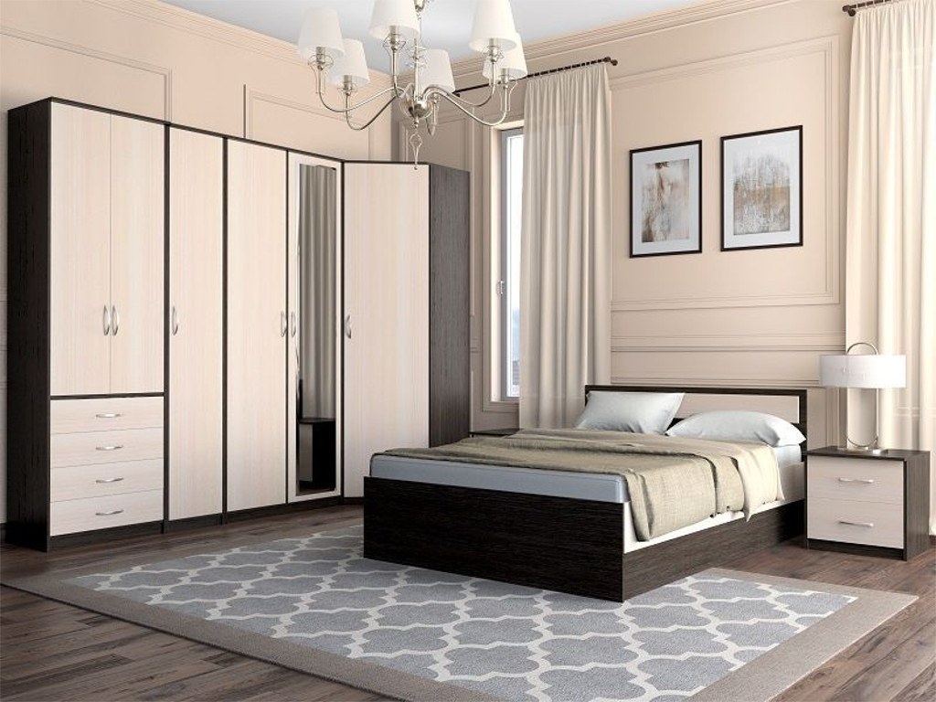 Состав комплекта: кровать-1200, шкаф угловой (без зеркала), шкаф 2-х ств. (с зеркалом) , пенал, шкаф универсальный, тумба прикроватная - 2шт