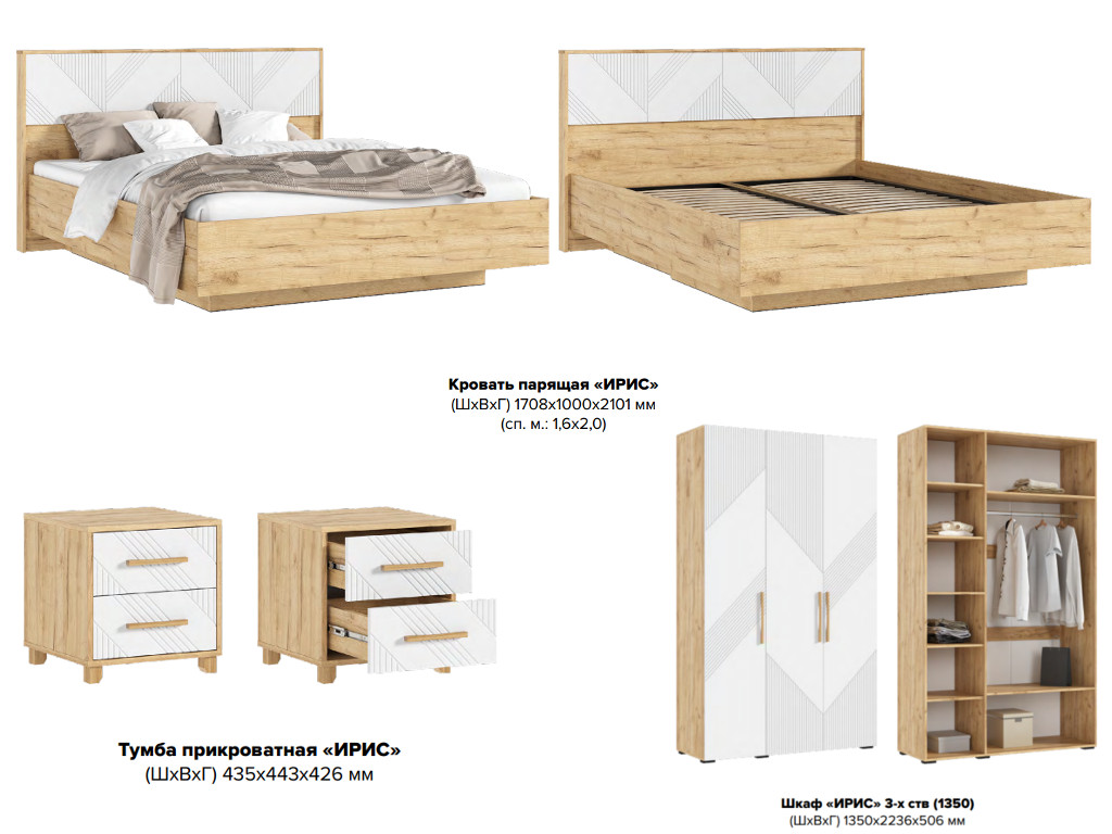 Цена за комплект: Кровать парящая 1,6м (ортопед дерево), Шкаф 3-х створчатый, Тумбы прикроватные