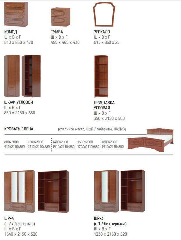 Цена за комплект: зеркало навесное, комод 4 ящика, тумба прикроватная, шкаф ШР-4 платье и бельё с зеркалом, Комплектующие на кровать с ламелями 1400 мм, кровать Елена 1400мм
