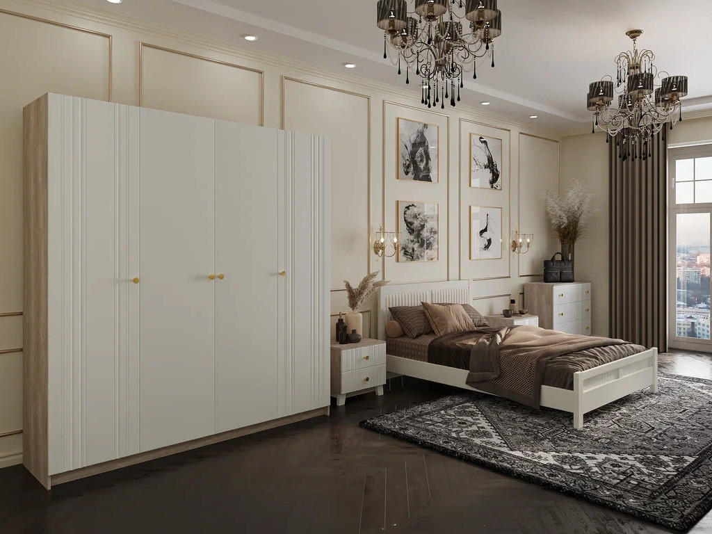 Цена за комплект: шкаф ШР-4, тумба прикроватная (2 шт), кровать двойная "Фрида" 1400, Комплектующие на кровать с ламелями 1400 мм, комод 3 ящика