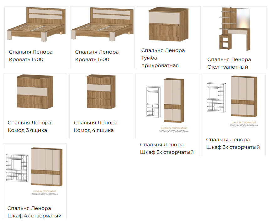 Цена указана за комплектацию: Шкаф 4х створчатый, Кровать 1400, Тумба прикроватная, Комод 4 ящика
