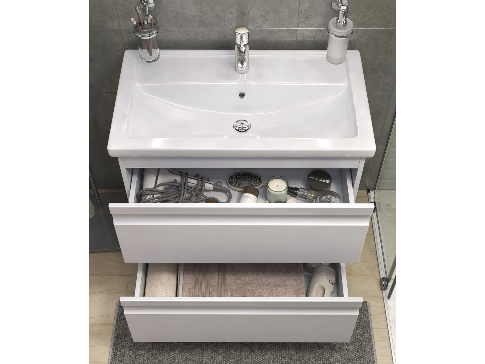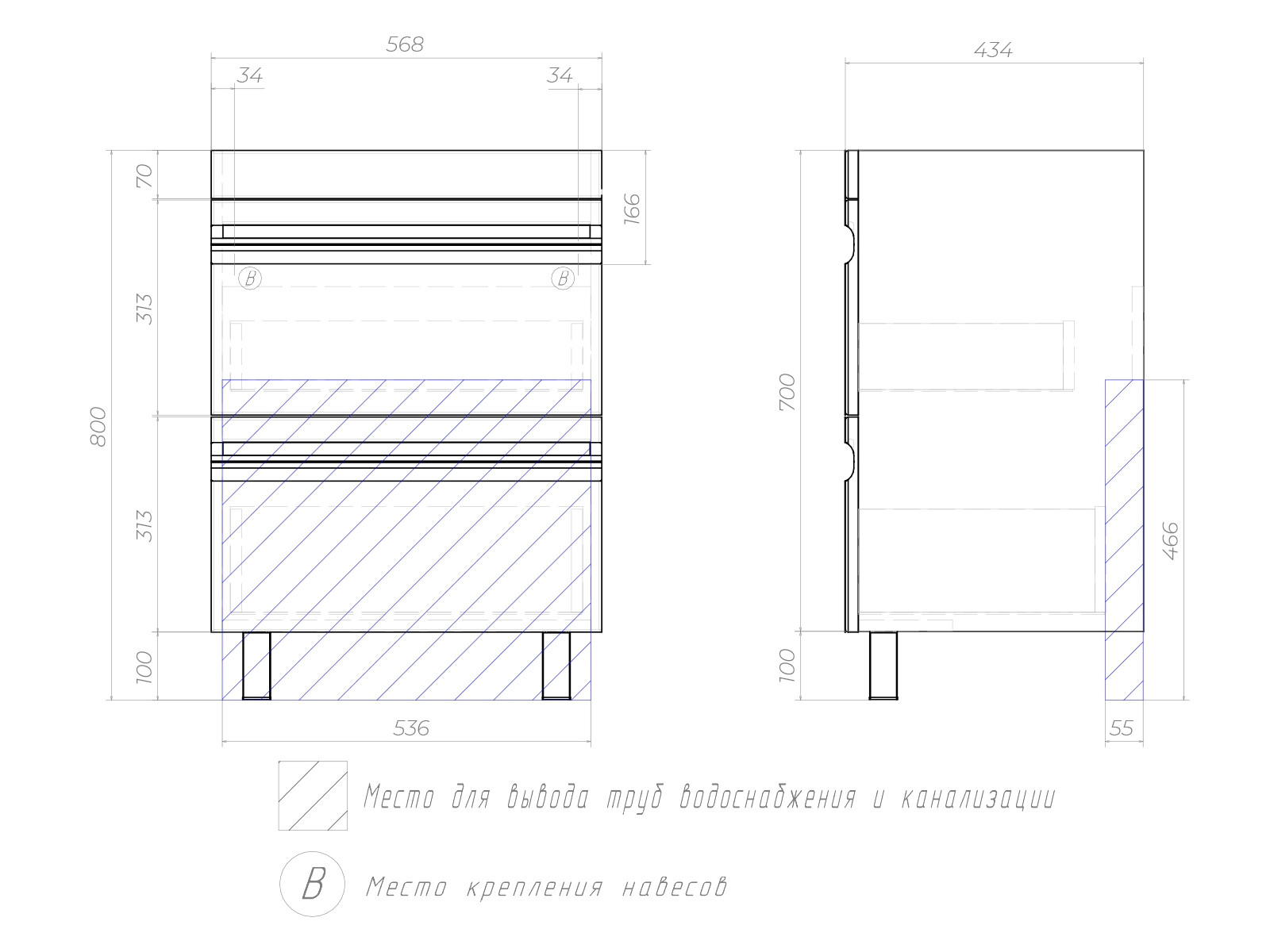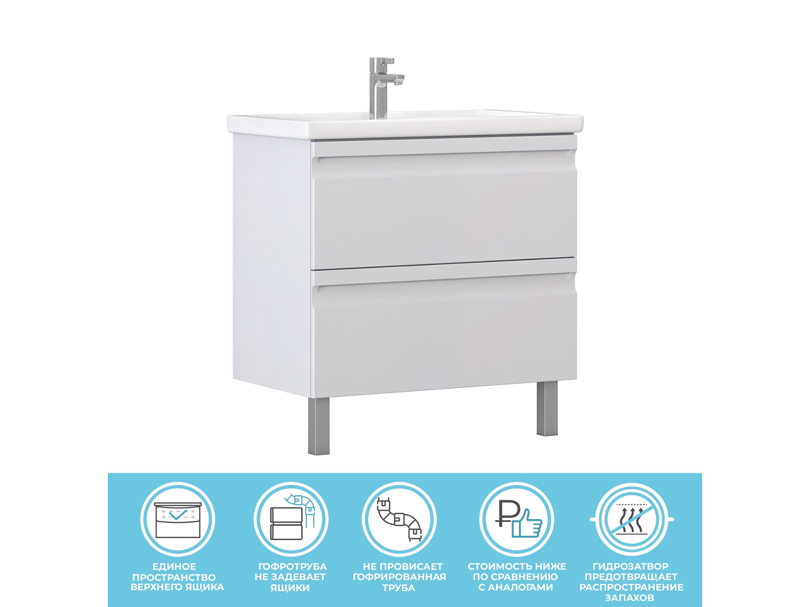 Оснащение:  2 выдвижных ящика, шариковые направляющие полного выдвижения, 2 опоры квадратные регулируемые, 1 сифон