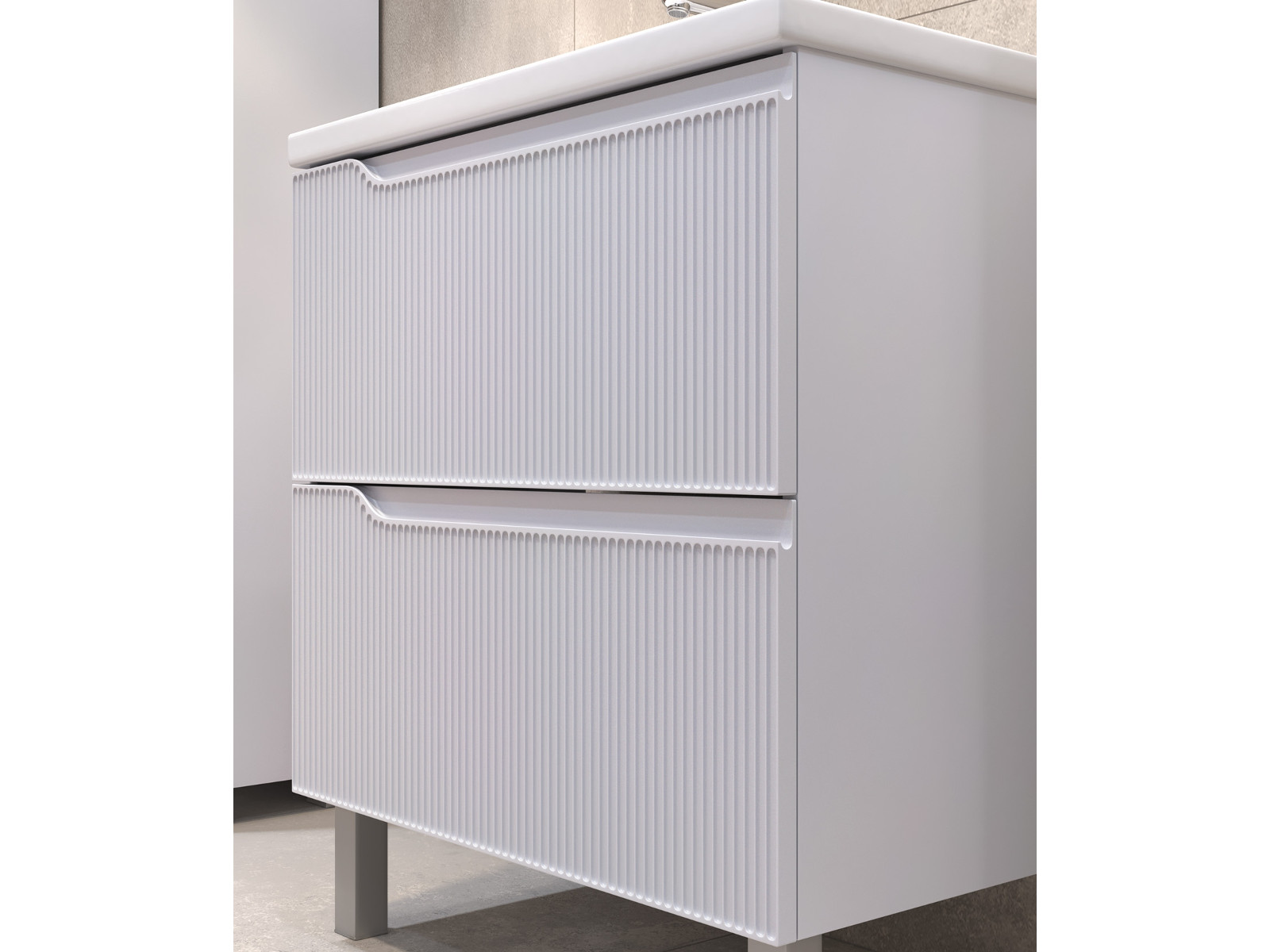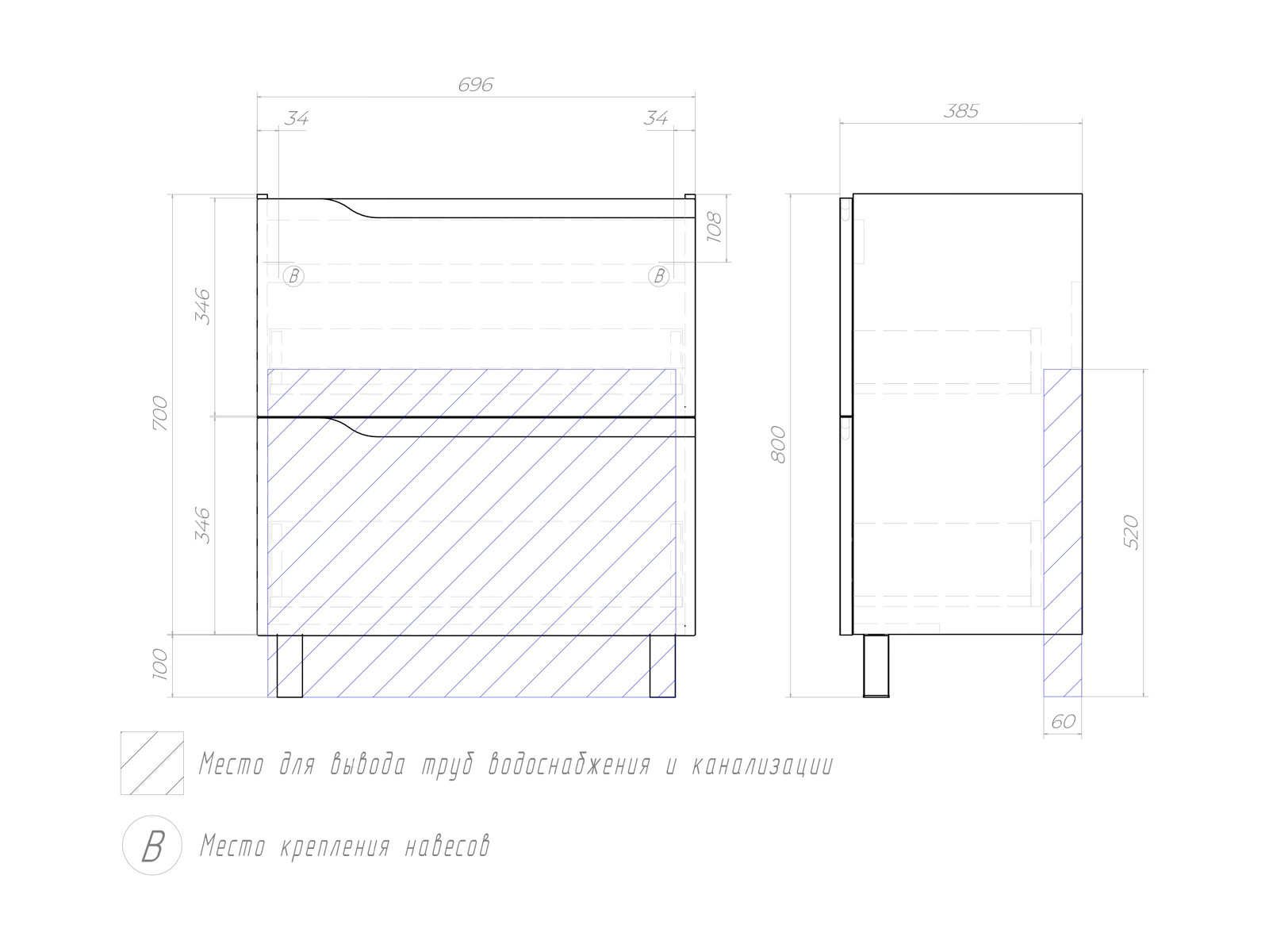 Оснащение: 2 выдвижных ящика, направляющие скрытого монтажа, 2 навеса, 2 опоры квадратные регулируемые, 1 сифон