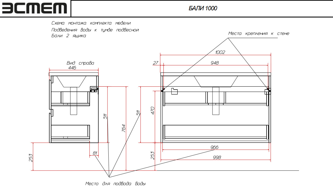 - Тумба с раковиной Bali 1000 навесная 2 ящика