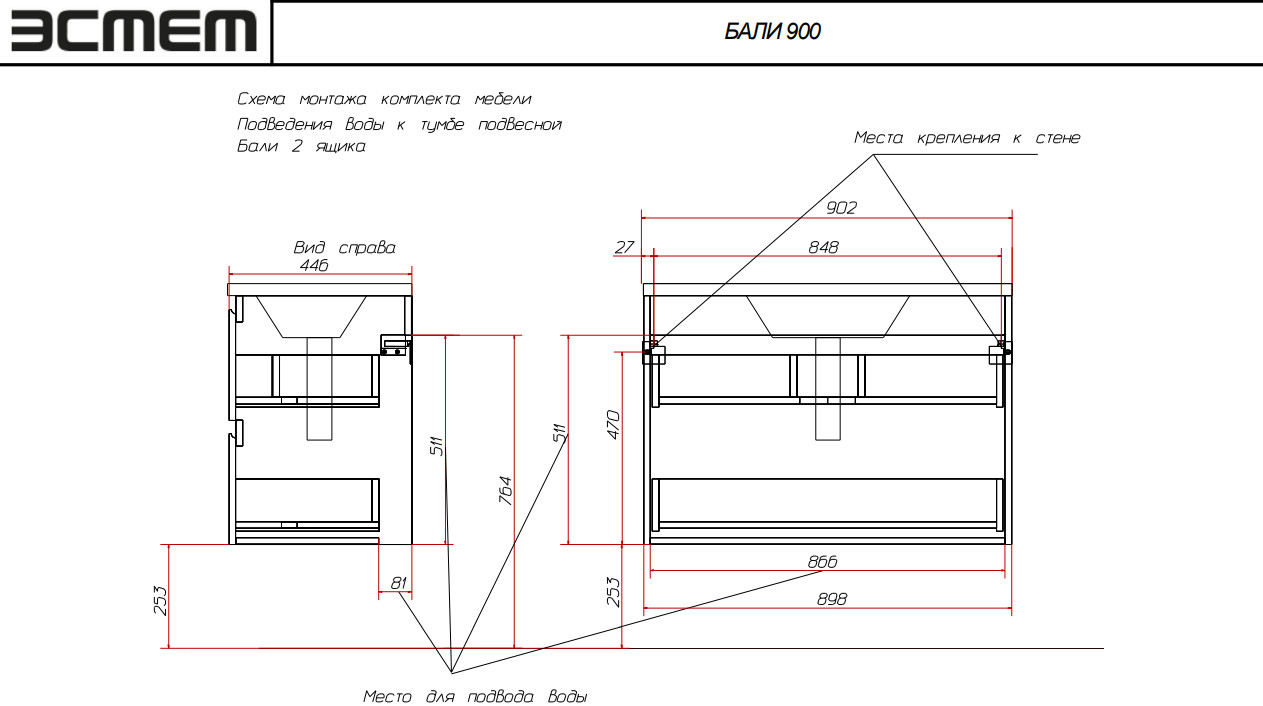 - Тумба с раковиной Bali 900 навесная 2 ящика