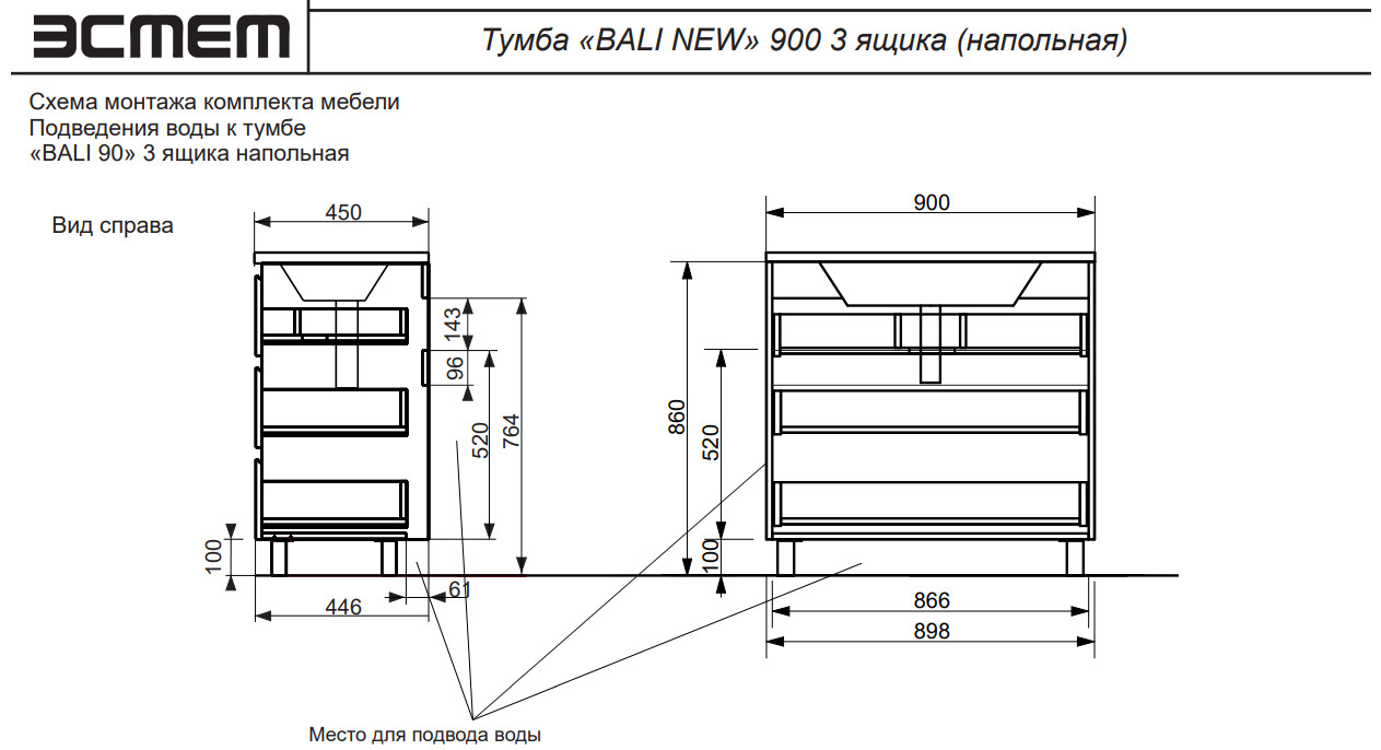- Тумба с раковиной Bali new 900 напольная 3 ящика