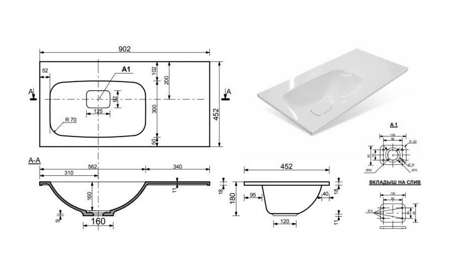 - Раковина из литьевого мрамора с одним отверстием под смеситель и рабочей поверхностью