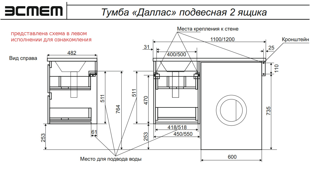 Тумба с раковиной Dallas Luxe 1100 навесная 2 ящика правая