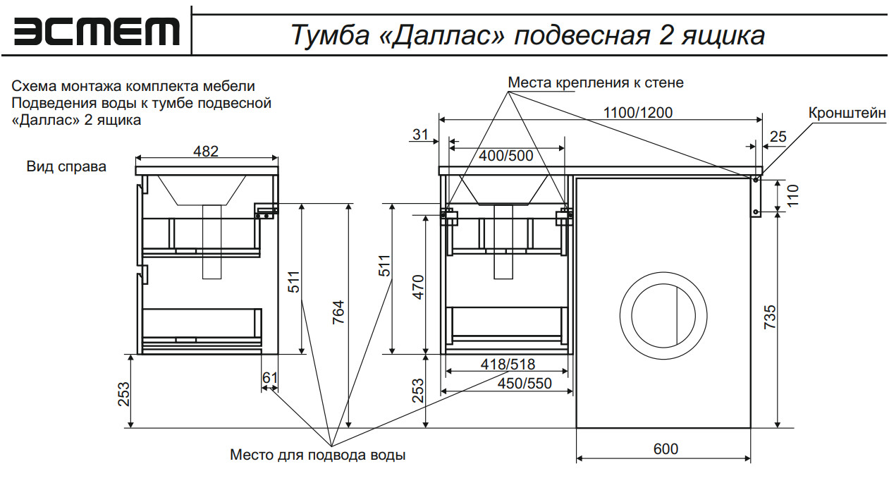 - Тумба с раковиной Dallas Luxe 1150 навесная 2 ящика левая