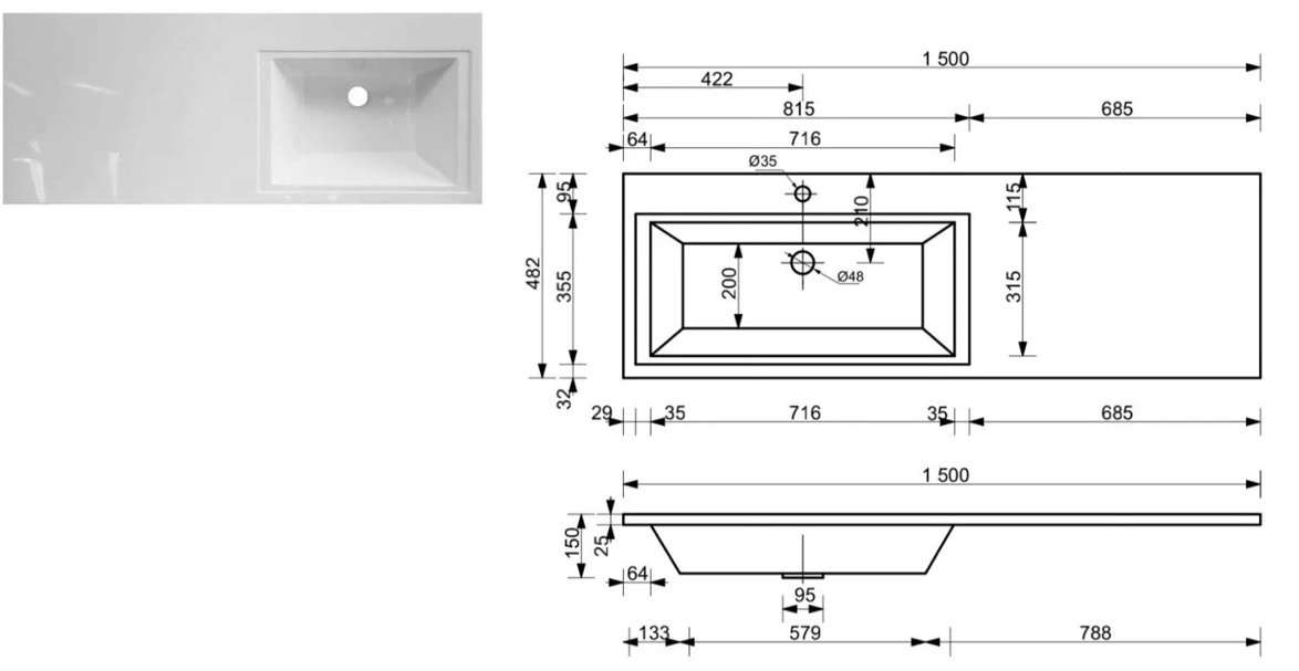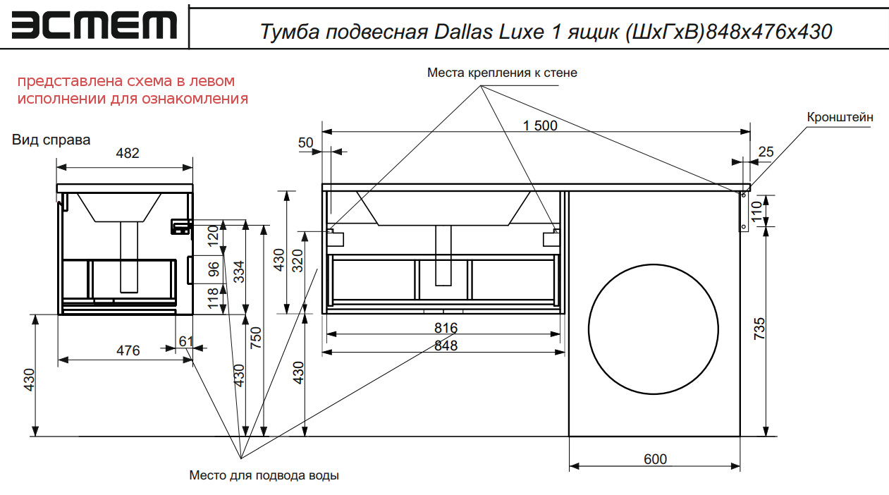 - Тумба с раковиной Dallas Luxe 1500 навесная 1 ящик правая