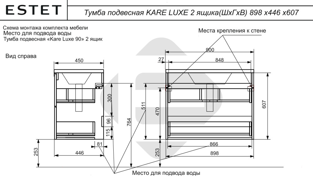 - Тумба с раковиной Kare Luxe 900 навесная 2 ящика