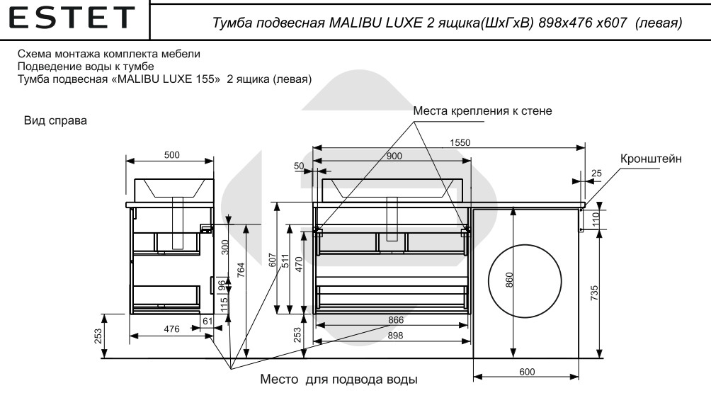 - Тумба с раковиной Malibu Luxe 1550 левосторонний подвесной 2 ящика