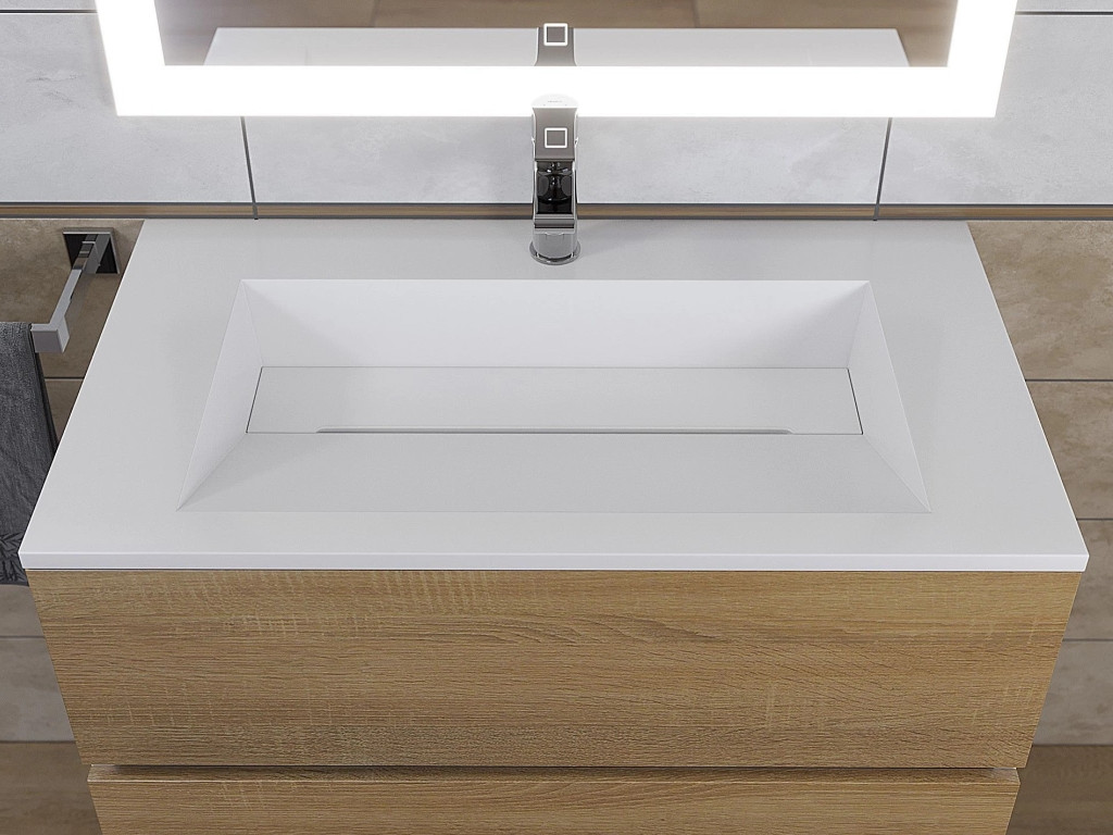 Фасад - ЛДСП в пленке под дерево, цвет дуб сонома. Выдвижные ящики изготовлены из влагостойкой ЛДСП. Ящики оснащены доводчиками. Фурнитура и доводчики премиум класса.