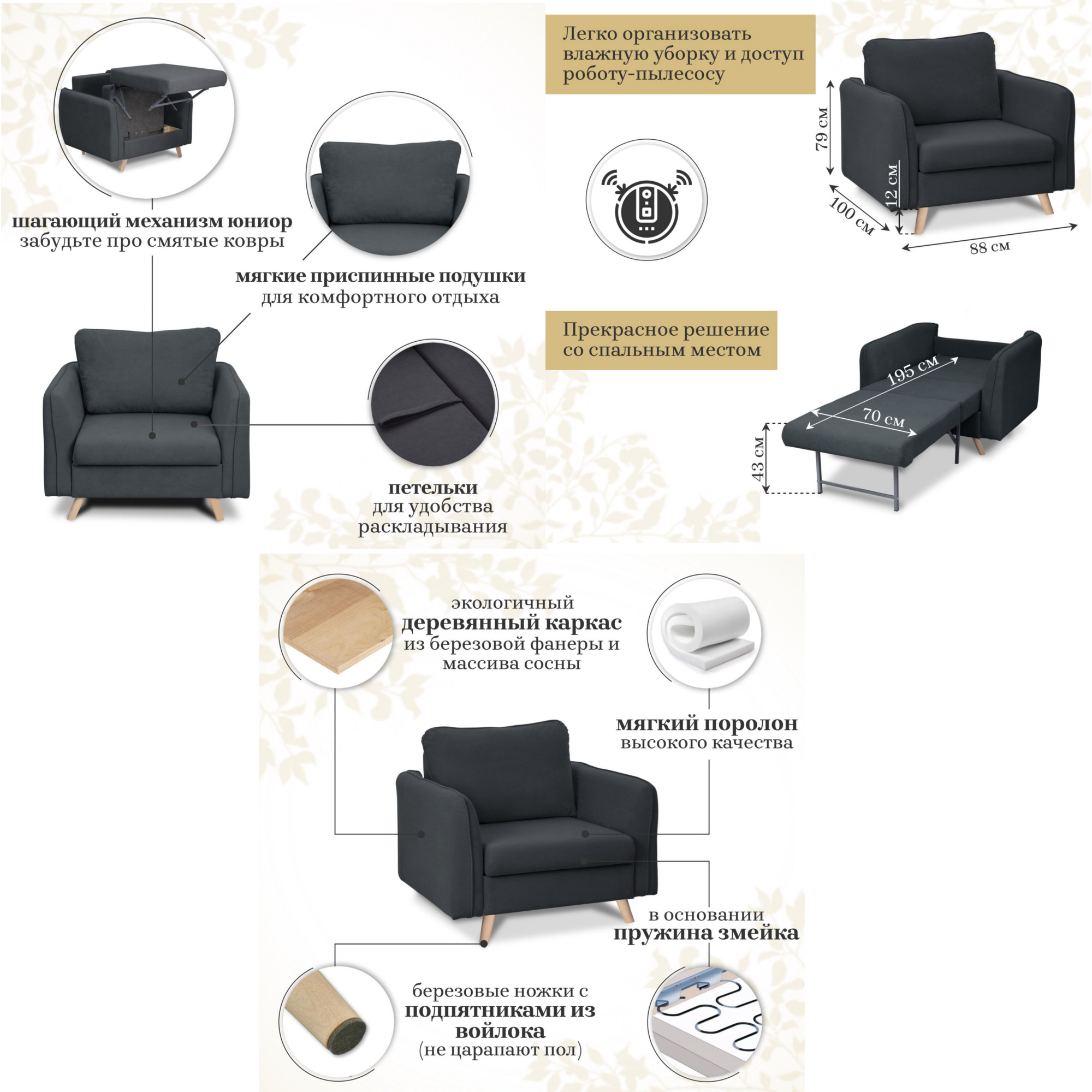 - Спальное место: 700х1950 мм