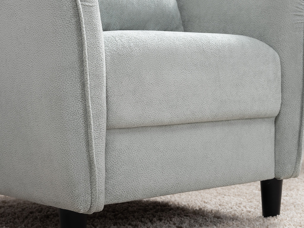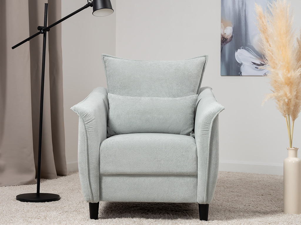 Кресло с приспинной подушкой трапецивидной формы на молнии, по трем сторонам которой проложена отделочная строчка на 1,2 см. По контуру боковин проложен декоративный кант на 1,2 см основной ткани. Кант проходит по центру передней части боковины, а по внутренней верхней части сборка.