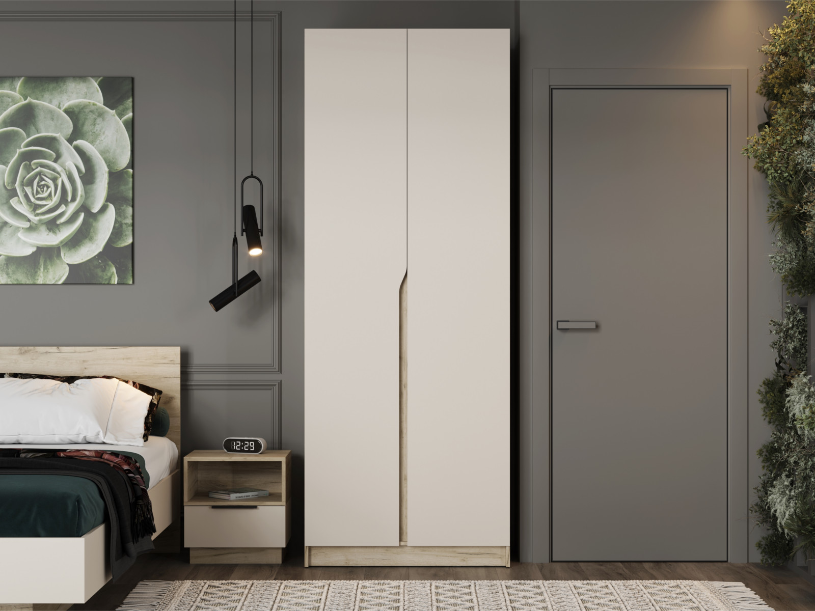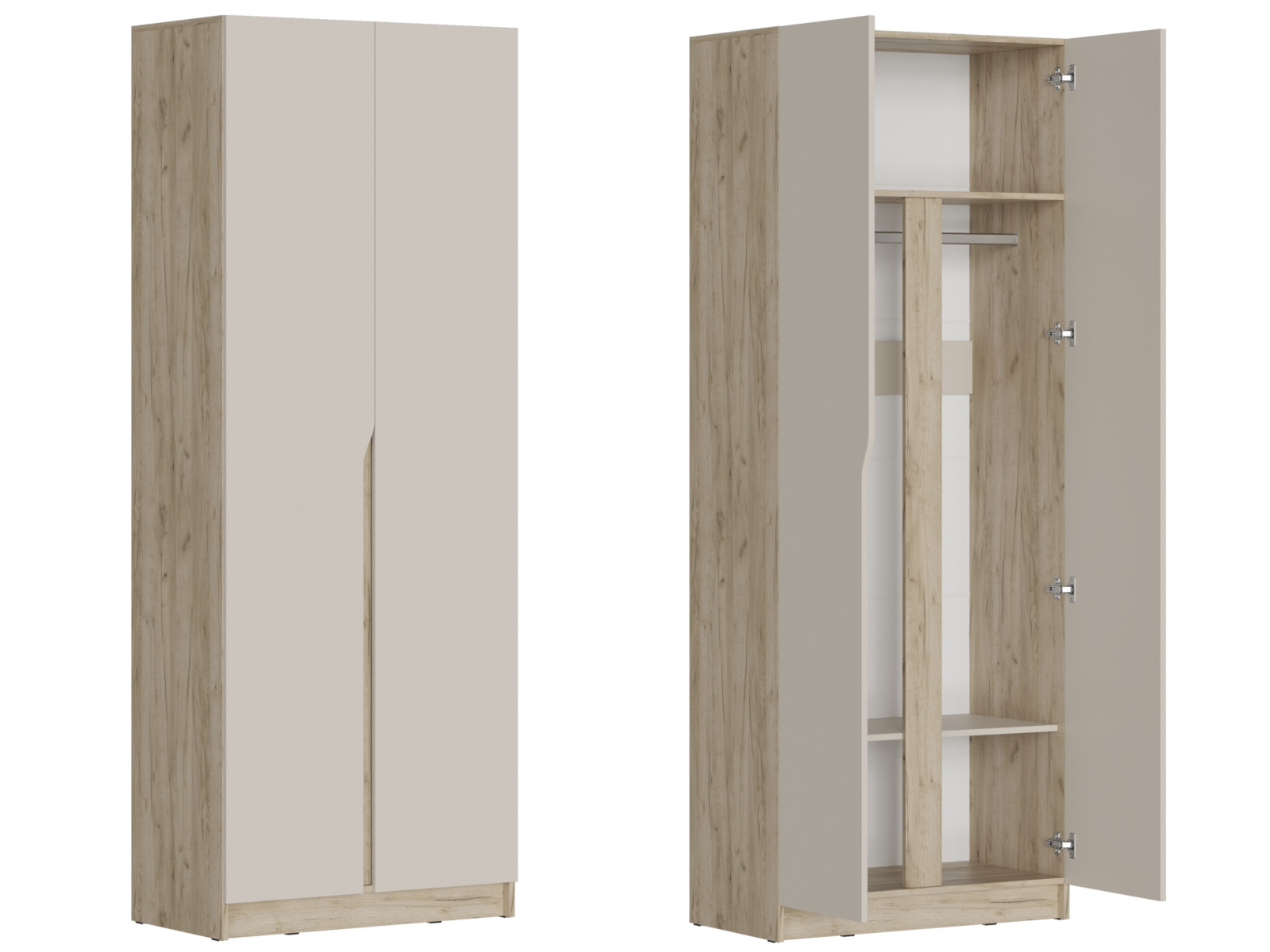 Без ручек: открывание осуществляется за декоративный вырез на левой створке, а зазор между фасадами закрыт декоративной планкой в цвет корпуса.
