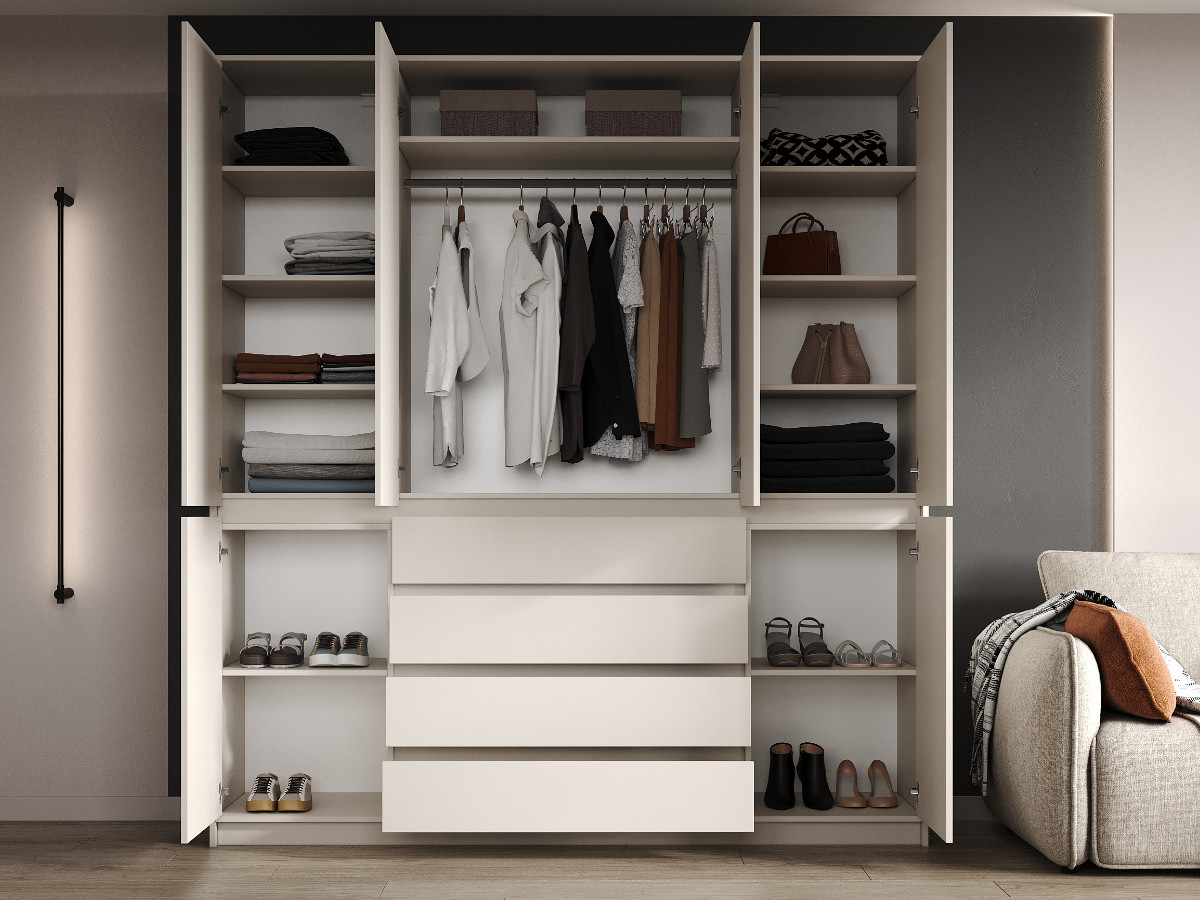 - Верхняя часть шкафа закрывается створками ЛДСП в цвет корпуса, нижняя фасадами МДФ с фрезеровкой. Створки, которые устанавливаются на перегородки, комплектуются полунакладными петлями. На боковины створки крепятся внутренними петлями.