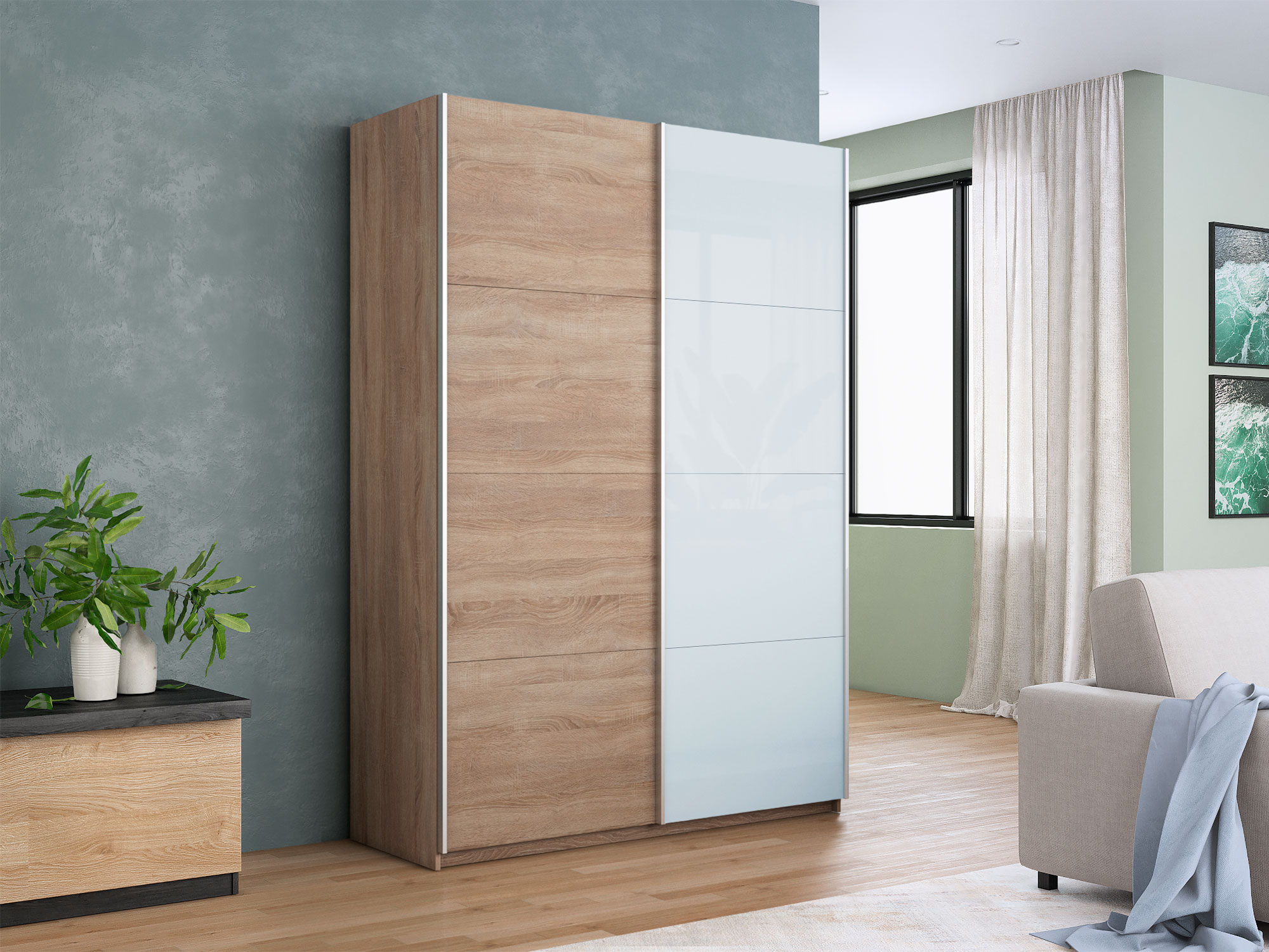 - Усиленная навесная система дверей помогает ходовому профилю выдерживать высокие нагрузки, а также сохраняет полезную площадь внутри шкафа, благодаря установке снаружи корпуса