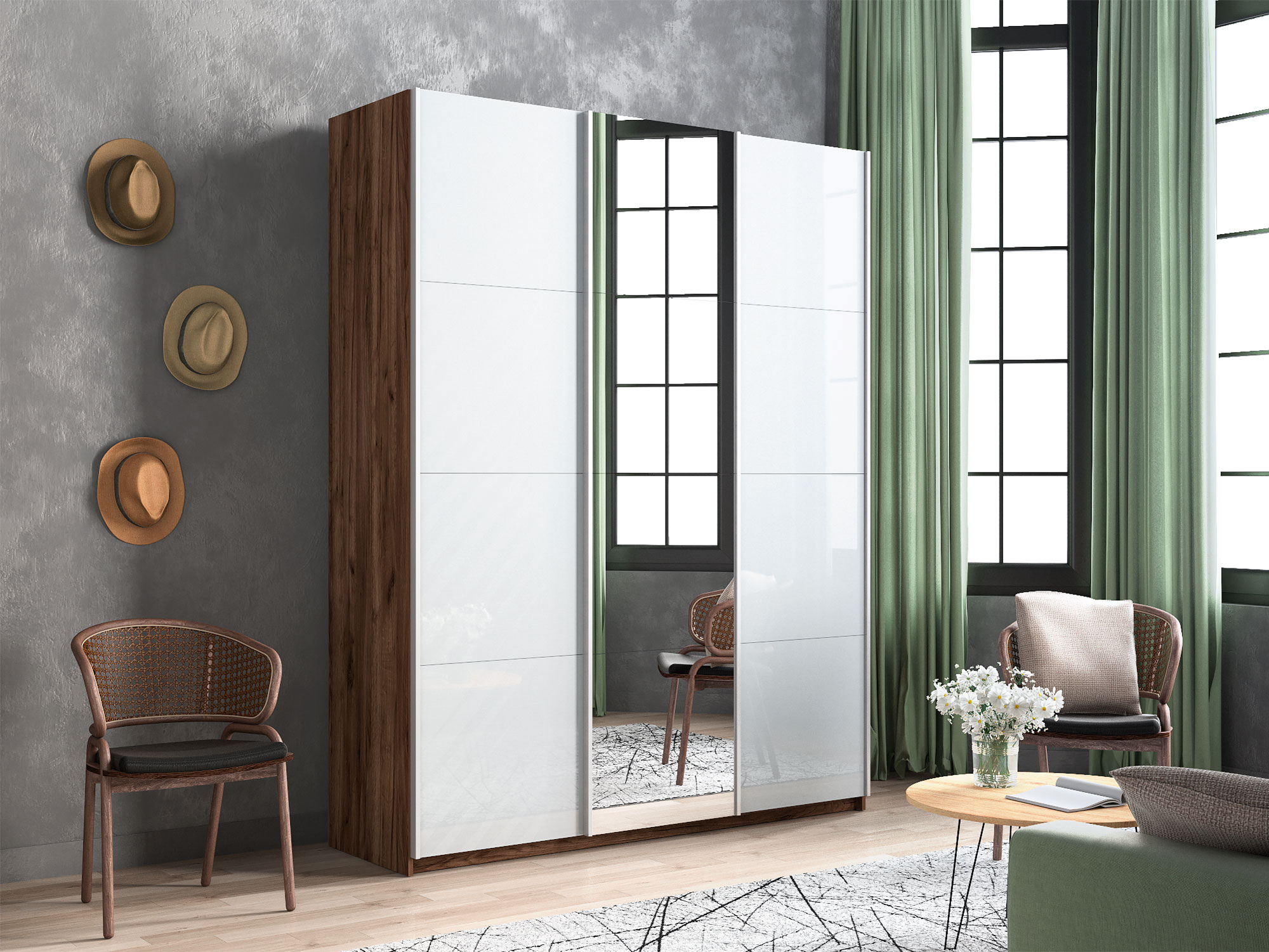 Шкаф-купе Прайм 3-х дверный 1800 два Стекла Белые/Зеркало Крафт табачный