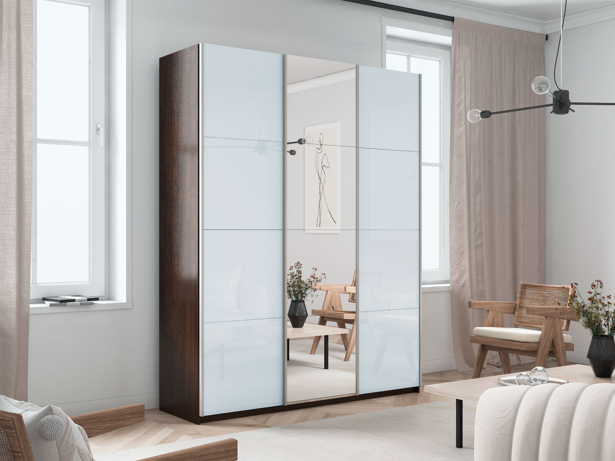 - Шкаф-купе Прайм 3-х дверный 1800 два Стекла Белые/Зеркало Венге
