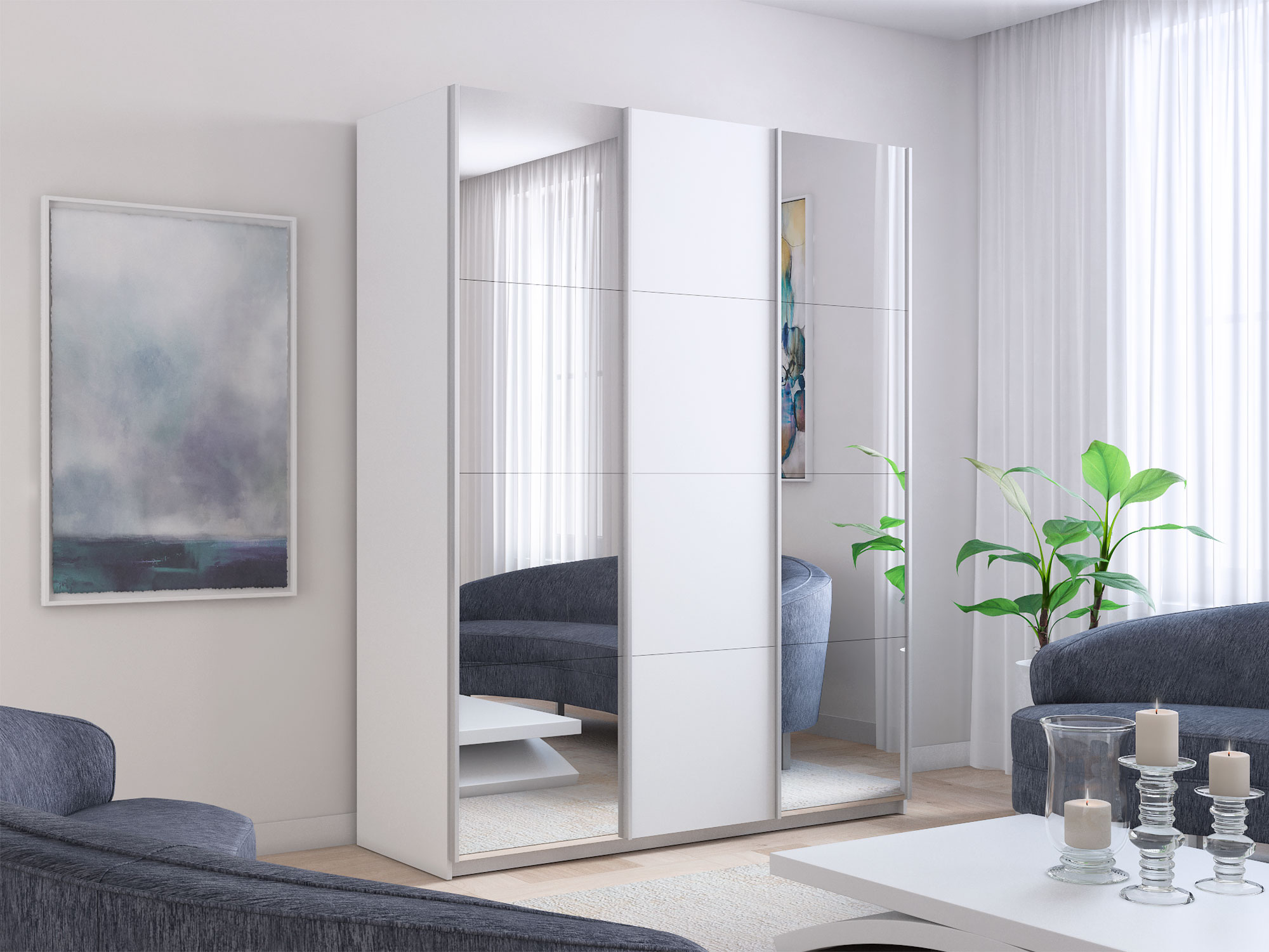- Шкаф-купе Прайм 3-х дверный 1800 два Зеркала/ДСП Белый Снег
