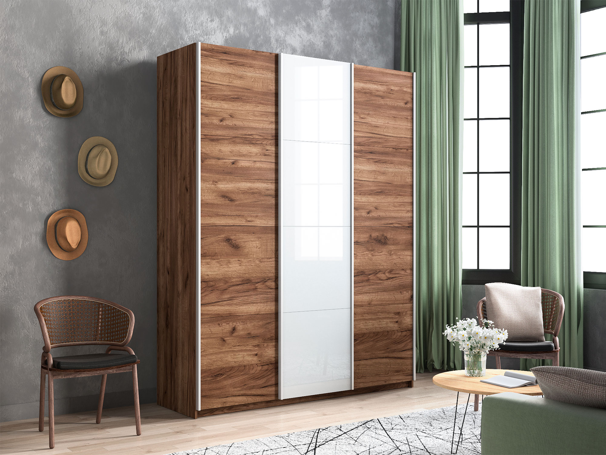 - Шкаф-купе Прайм 3-х дверный 2100 ДСП/Стекло Белое/ДСП Крафт табачный