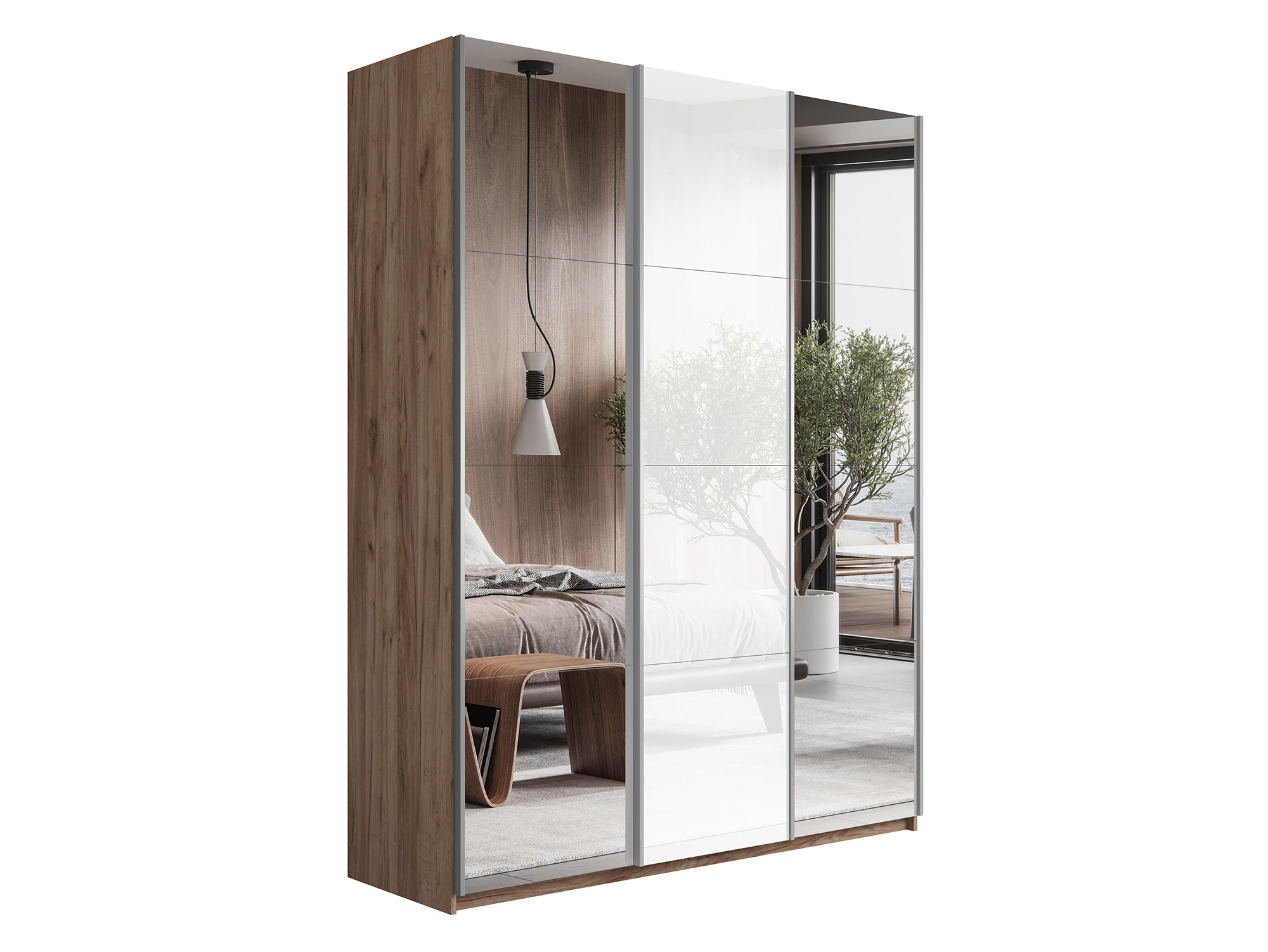 - Шкаф-купе Прайм 3-х дверный 2100 Зеркало/Стекло Белое/Зеркало Крафт табачный