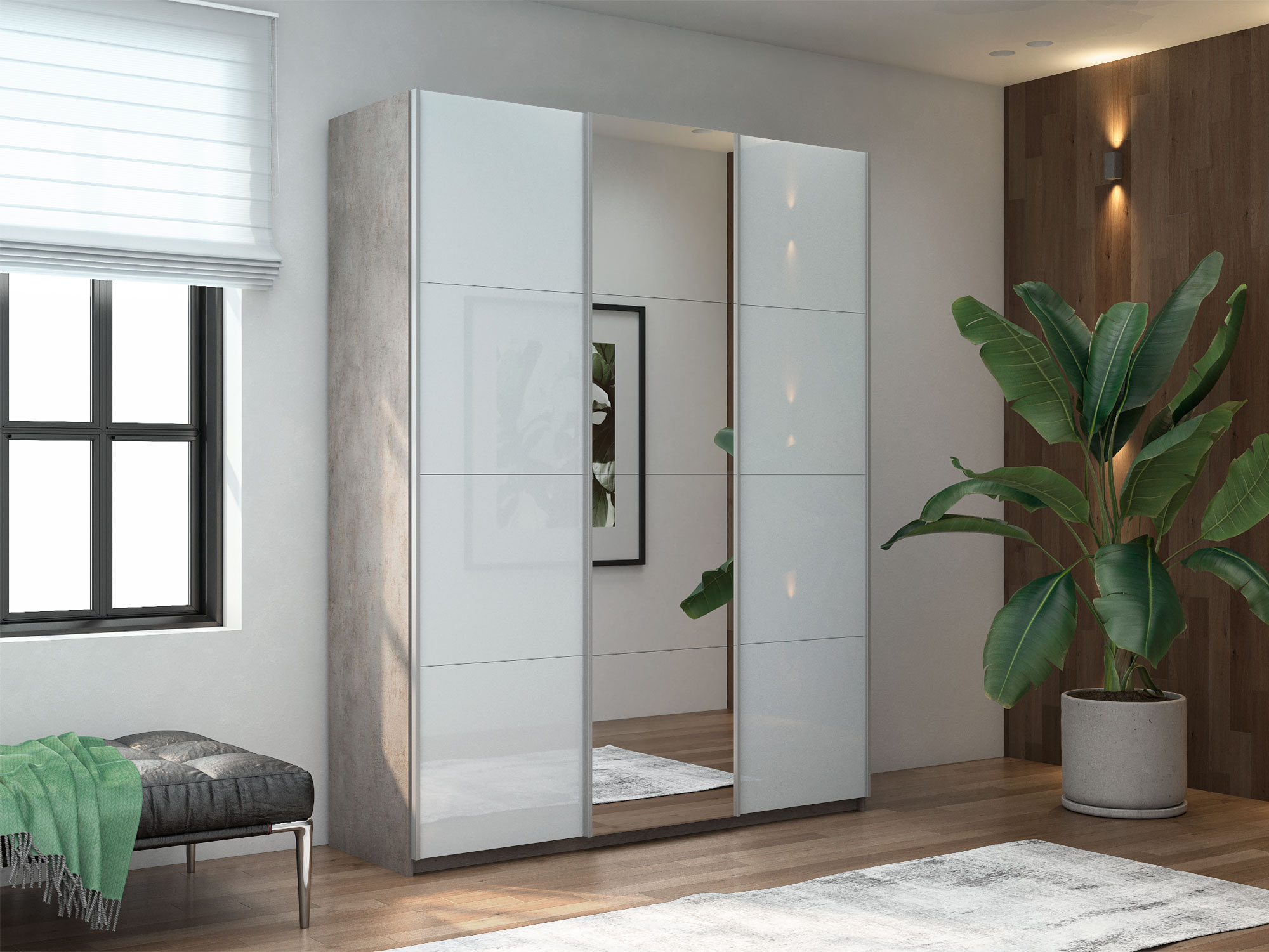 Шкаф-купе Прайм Широкий 3-х дверный два белых стекла/зеркало Бетон