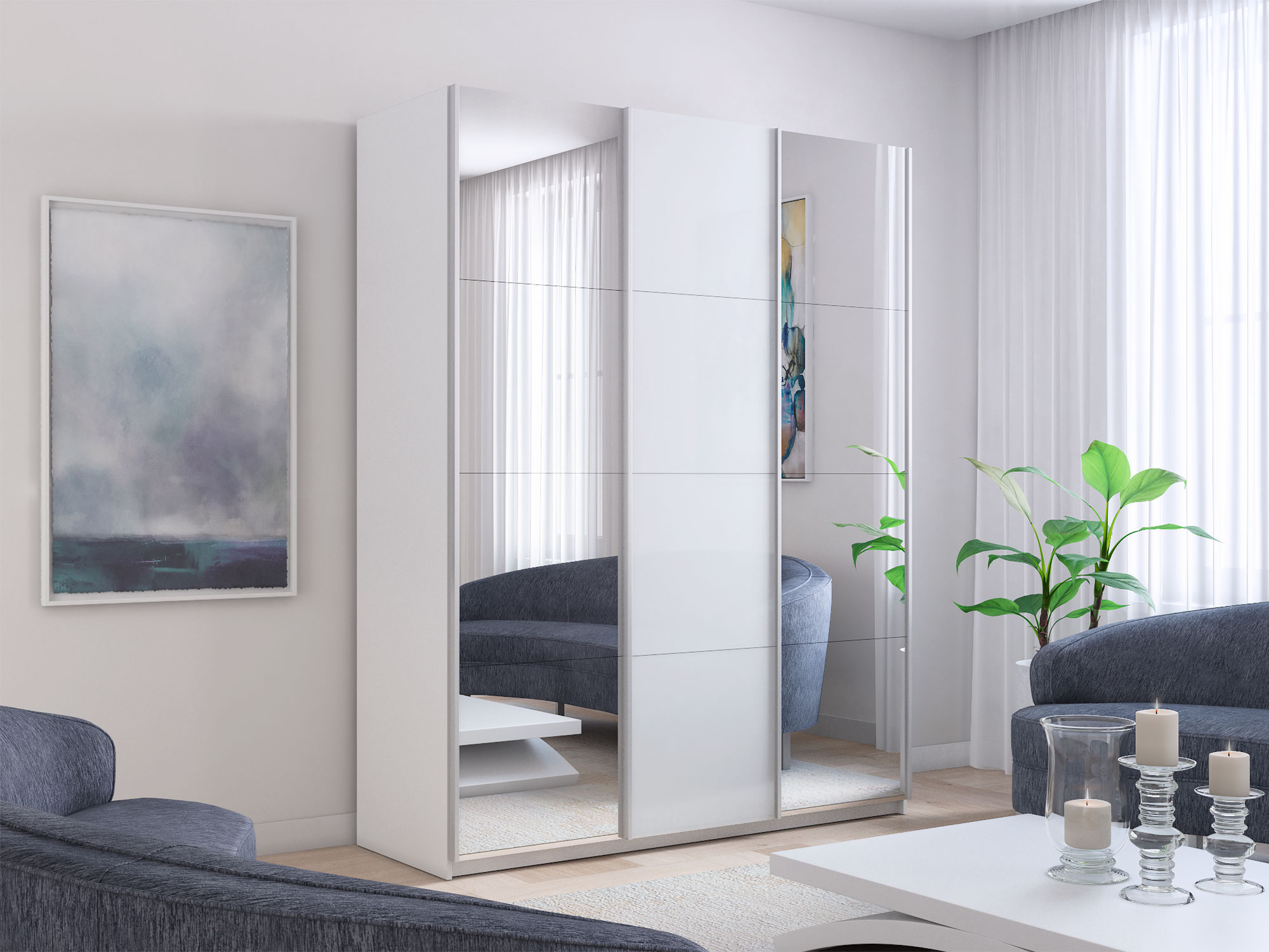 - Шкаф-купе Прайм Широкий 3-х дверный два зеркала/ДСП Белый Снег