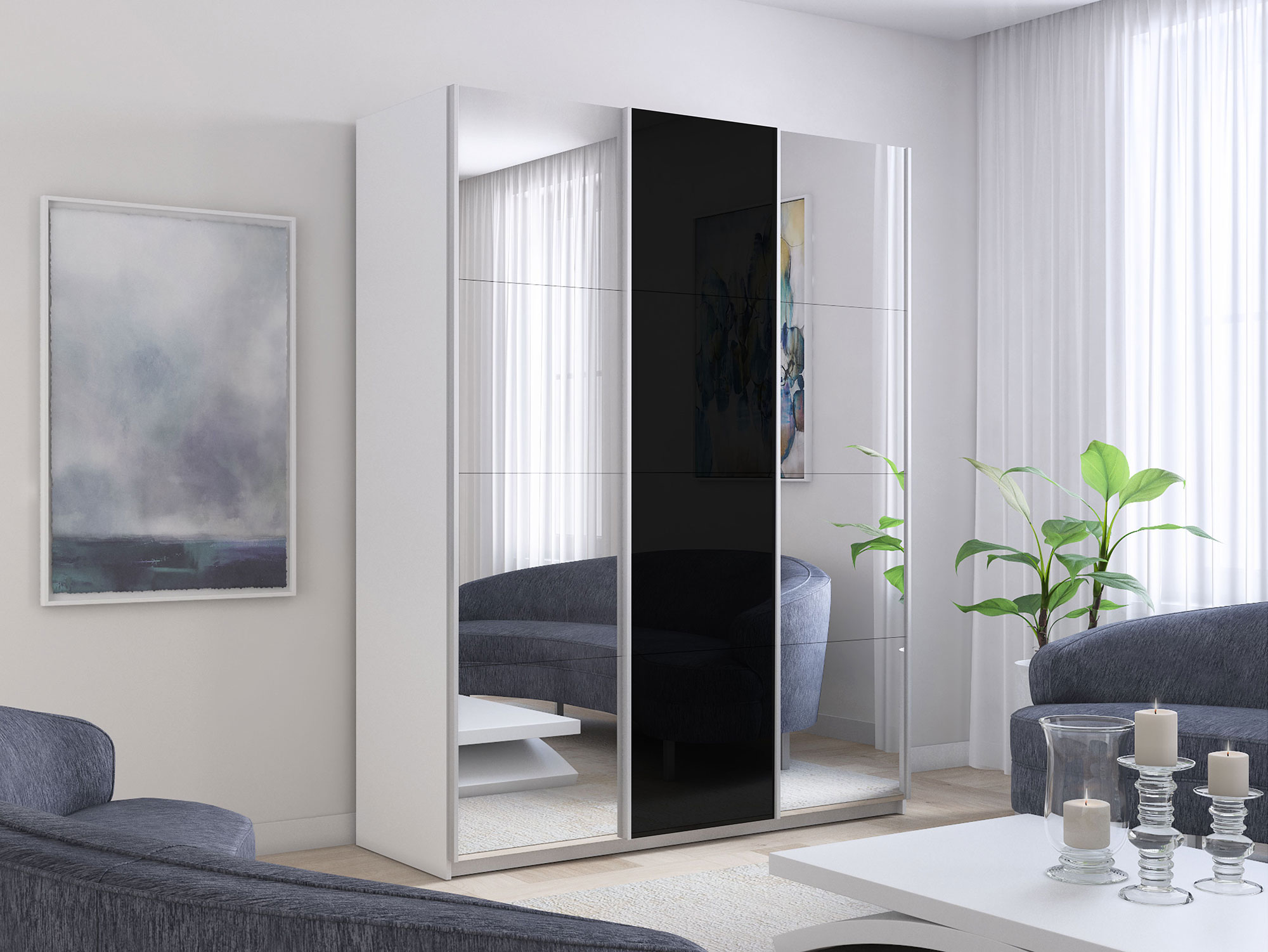 - Шкаф-купе Прайм Широкий 3-х дверный два зеркала/стекло черное Белый Снег