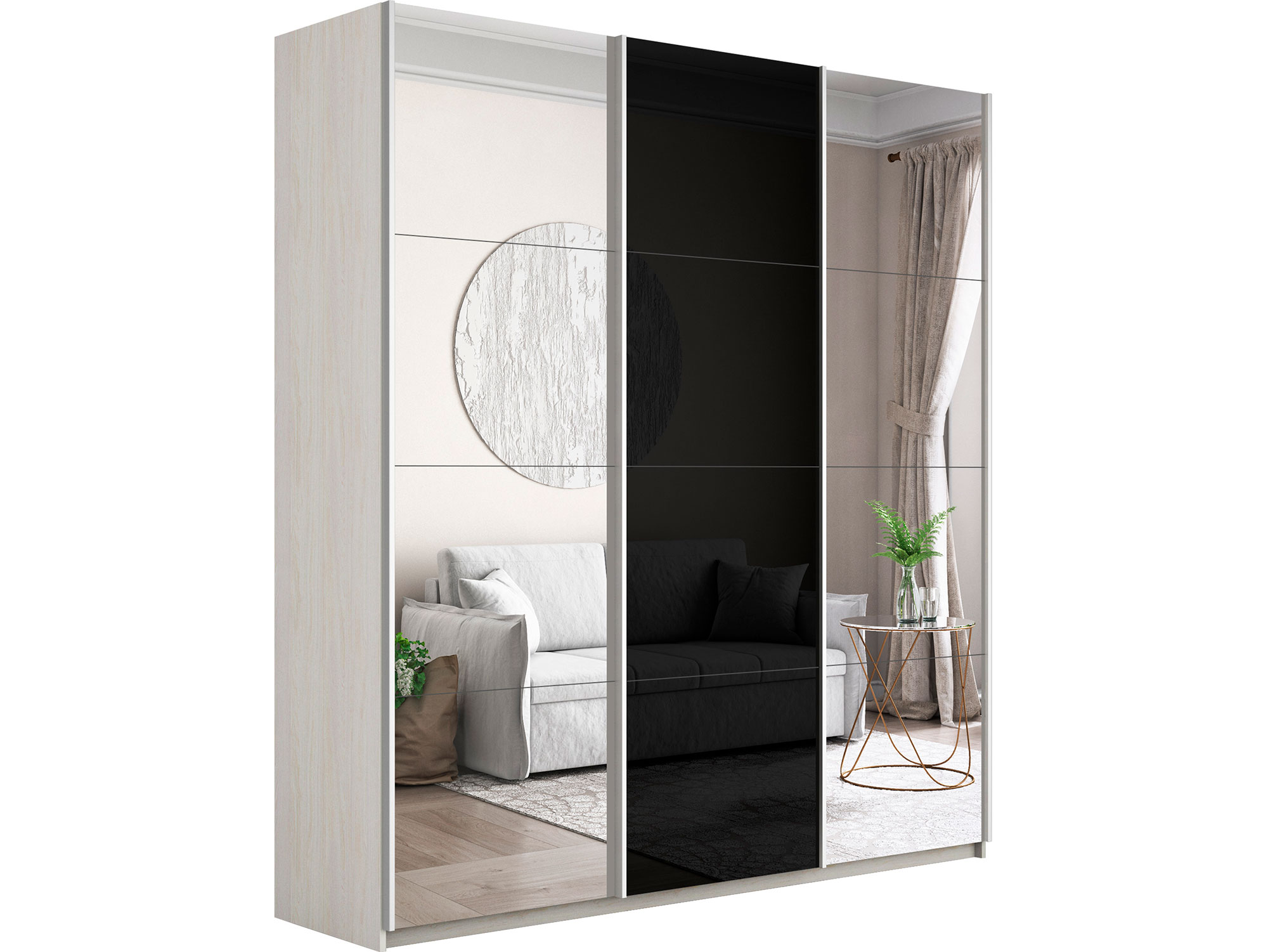 - Шкаф-купе Прайм Широкий 3-х дверный два зеркала/стекло черное Ясень Анкор Светлый