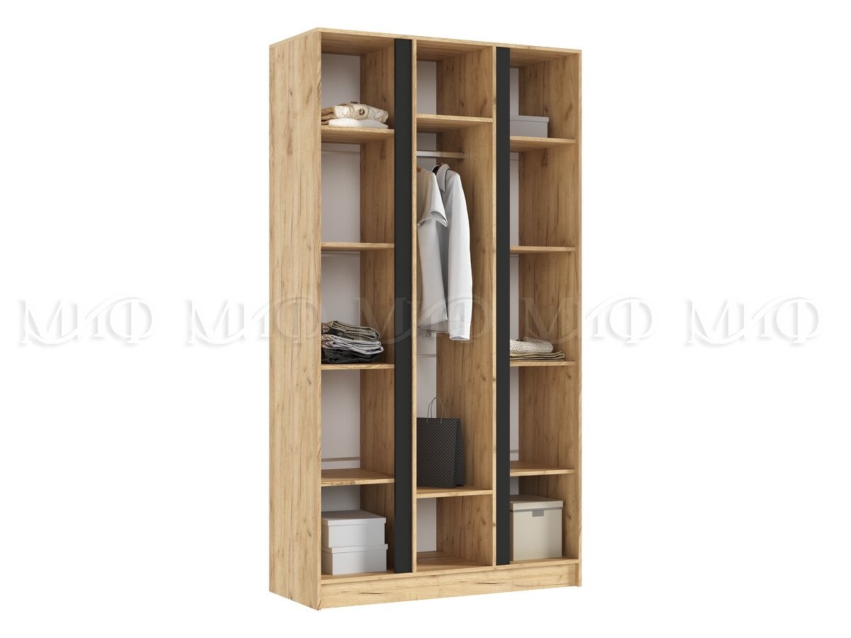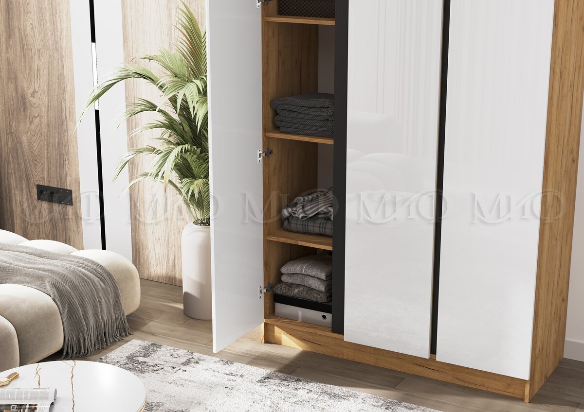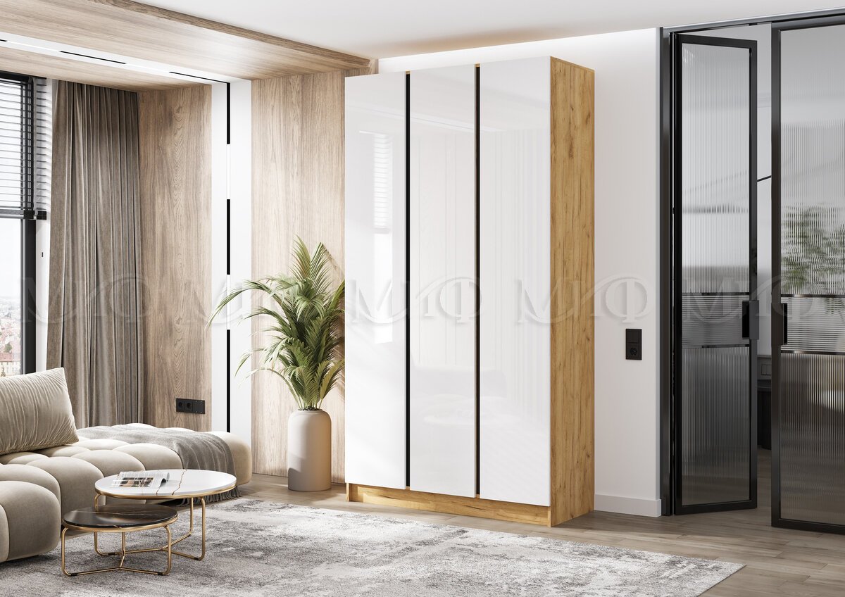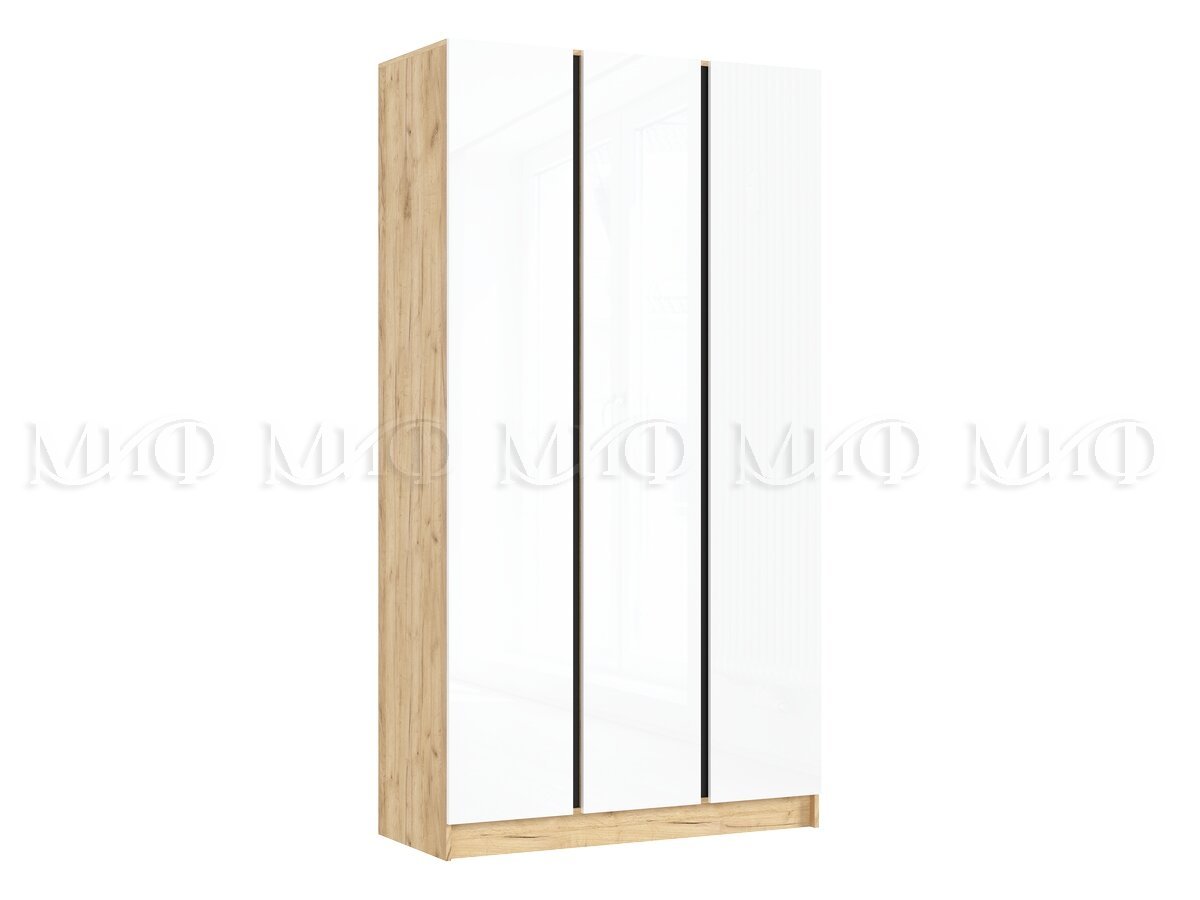 - Шкаф трехстворчатый Келвин (1200) Белый Глянец, Дуб Крафт-вставка черная