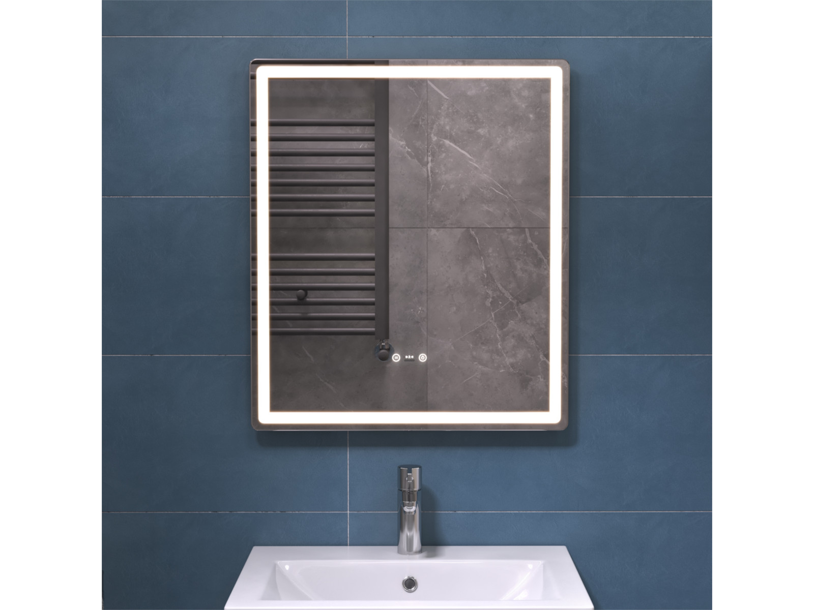 Подсветка фронтальная по периметру, с цветовой температурой 5000К – нейтральный белый, управление подсветкой сенсорное/датчик присутствия (1.5 м.)